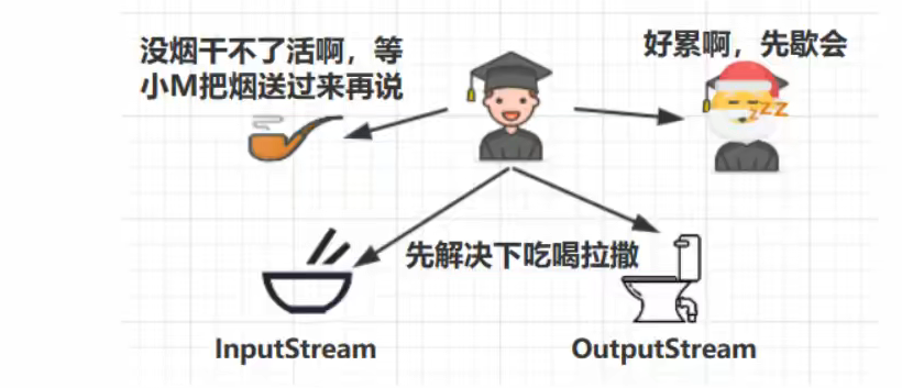 好接下来,老王就把算盘租给小明用,但是由于小明在一些特殊情况没有使用,比如 睡觉的时候(sleep),吃饭的时候(比如读文件->InputStream),在比如上厕所的时候(写文件-->OutputStream)这种阻塞IO操作,还有的时候会放松一下(wait操作),这些时间小明都会进行阻塞状态.也就是这些时间内小明并没有使用算盘,而是占用着.