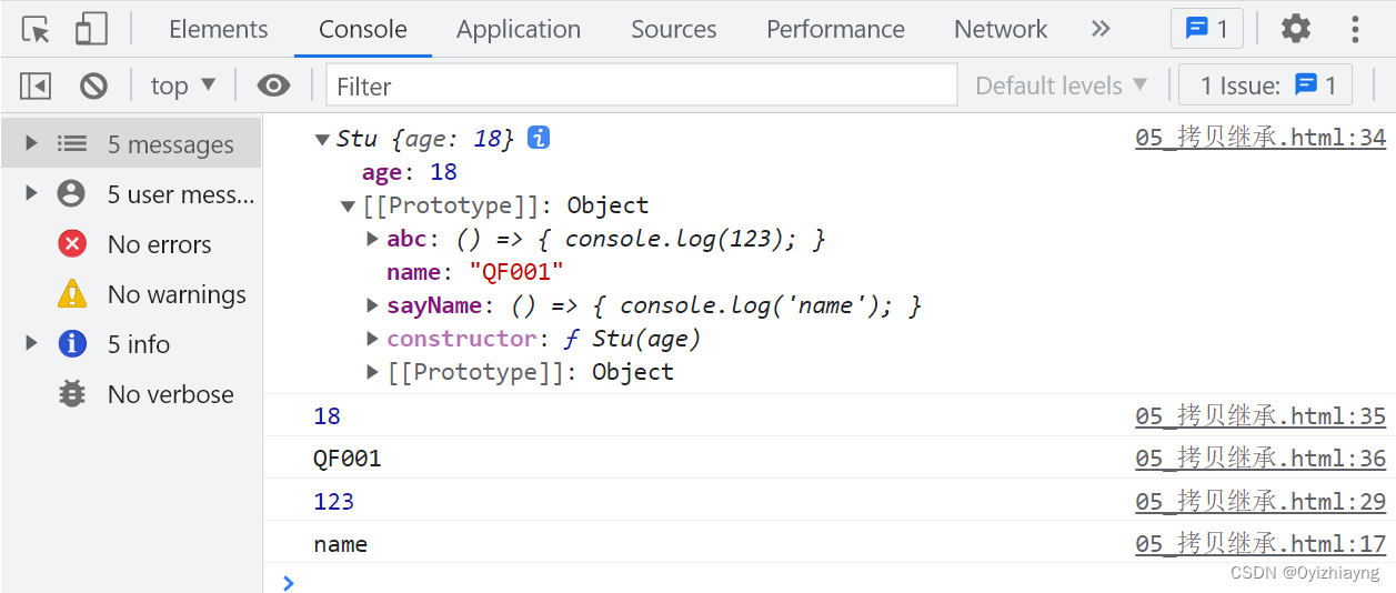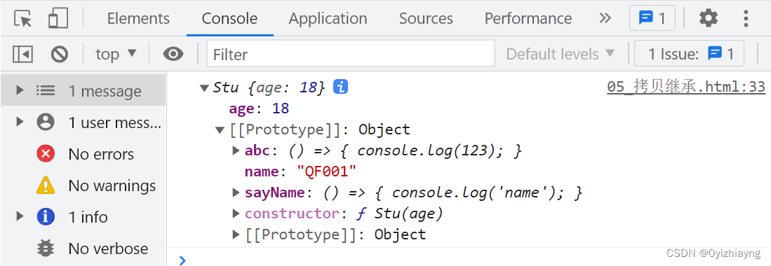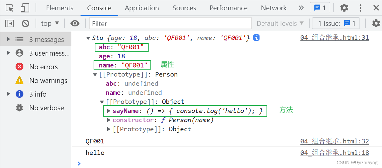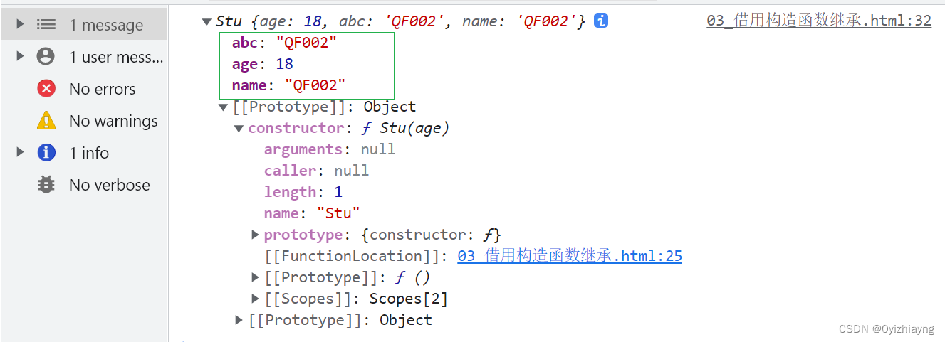 function Person(name) {this.abc = name;this.name = name;}Person.prototype.sayName = () => {console.log('hello');}function Stu(age) {this.age = age;// 2. 利用借用继承, 继承到父类的构造函数内部的属性Person.call(this, 'QF001');}// 1. 利用原型继承, 继承到父类的原型上的方法Stu.prototype = new Person();const s = new Stu(18);console.log(s);console.log(s.name);s.sayName();
