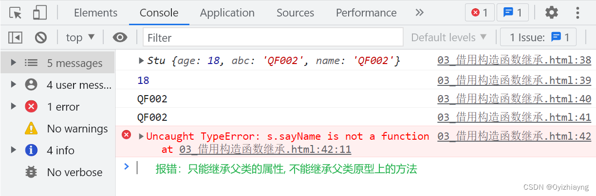 function Person(name) {this.abc = name;this.name = name;}Person.prototype.sayName = () => {console.log('name');}function Stu(age) {this.age = age;Person.call(this, 'QF002');}const s = new Stu(18);// 需求:使用Person内部的name和sayName 方法console.log(s);console.log(s.age);console.log(s.abc);console.log(s.name);s.sayName() //报错:只能继承父类的属性, 不能继承父类原型上的方法