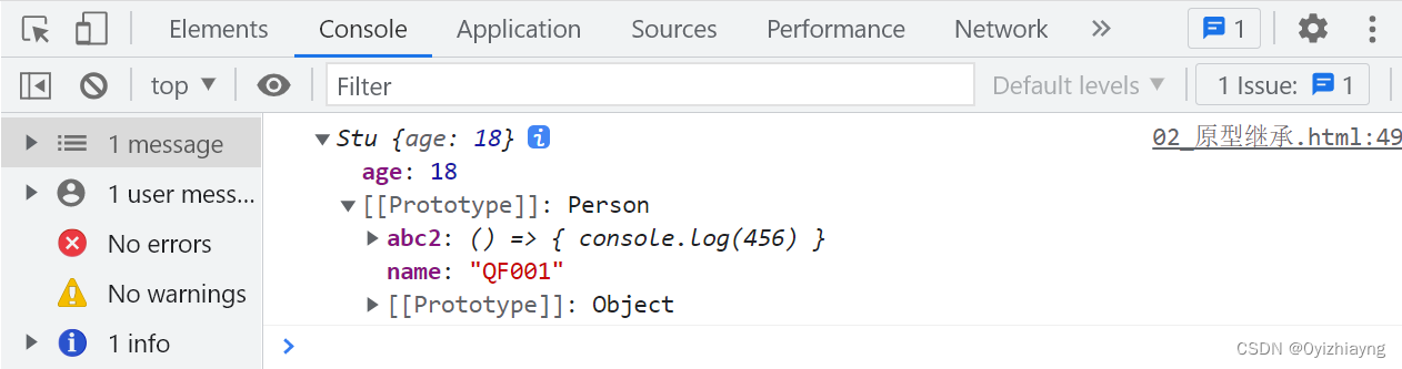 function Person(name) {this.name = name}Person.prototype.sayName = () => {console.log('name')}// 2. Person子类function Stu(age) {this.age = age}Stu.prototype.abc = () => {console.log(123)}// 原型的继承Stu.prototype = new Person('QF001')Stu.prototype.abc2 = () => {console.log(456)}const s = new Stu(18)console.log(s)console.log(s.age)console.log(s.name)s.sayName()