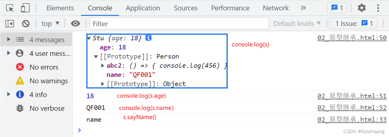 // 1. Person父类function Person(name) {this.name = name}Person.prototype.sayName = () => {console.log('name')}// 2. Person子类function Stu(age) {this.age = age}Stu.prototype.abc = () => {console.log(123)}// 原型的继承Stu.prototype = new Person('QF001')Stu.prototype.abc2 = () => {console.log(456)}const s = new Stu(18)// 需求:使用Person内部的name和sayName 方法console.log(s)