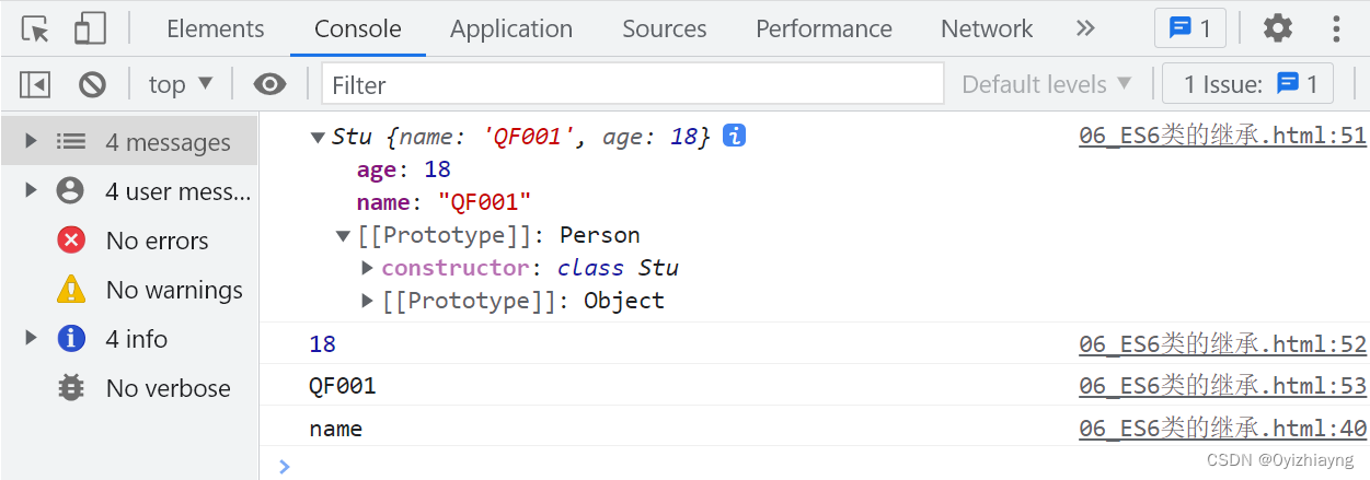 function Person (name) {this.name = name;}Person.prototype.sayName = function () {console.log('name');}class Stu extends Person {constructor(age) {super('QF001');this.age = age;}}const s = new Stu(18);console.log(s);console.log(s.age);console.log(s.name);s.sayName();