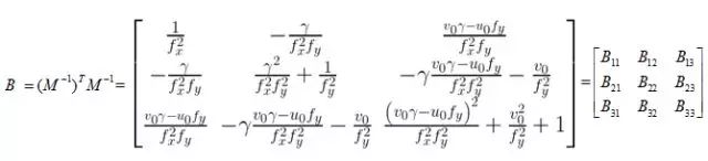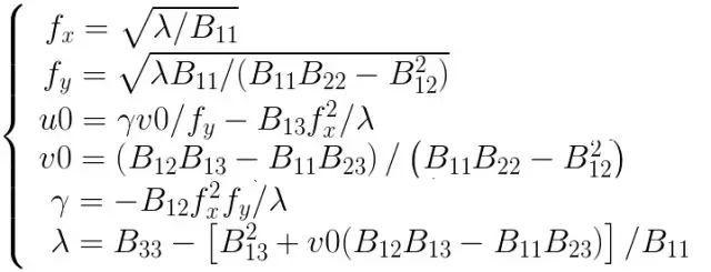 假设我们已经根据前面计算得到了矩阵B元素的值,那么根据已知的矩阵B很容易解出内参,如下: