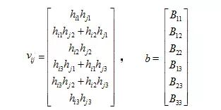 我们看到B为对称矩阵,真正有用的元素只有6个(主对角线任意一侧的6个元素)。把B带入前面两个约束条件后可转化为: