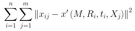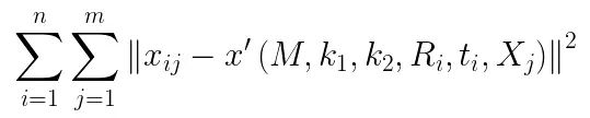 现在我们来考虑透镜畸变的影响,由于径向畸变的影响相对较明显,所以主要考虑径向畸变参数,根据经验,通常只考虑径向畸变的前两个参数k1,k2就可以(增加更多的参数会使得模型变的复杂且不稳定)。实际求解中,通常把k1,k2也作为参数加入上述函数一起进行优化,待优化函数如下所示: