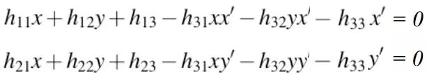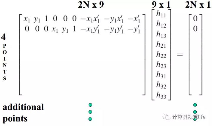 假如我们得到了两幅图片中对应的N个点对(特征点匹配对),那么可以得到如下线性方程组: