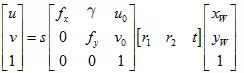 其中,u、v表示像素坐标系中的坐标,s表示尺度因子(等于1/zw),fx、fy、u0、v0、γ(由于制造误差产生的两个坐标轴偏斜参数,通常很小)表示5个相机内参,R(对应列向量r1、r2、r3),t表示相机外参,Xw、Yw、Zw(=0)(假设标定棋盘位于世界坐标系中Zw=0的平面)表示世界坐标系中的坐标。故我们这里把内外参合并看作H。