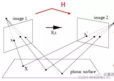 上图中x,x‘为一对匹配点,通过单应矩阵H实现在各自图像坐标系下的坐标转化。