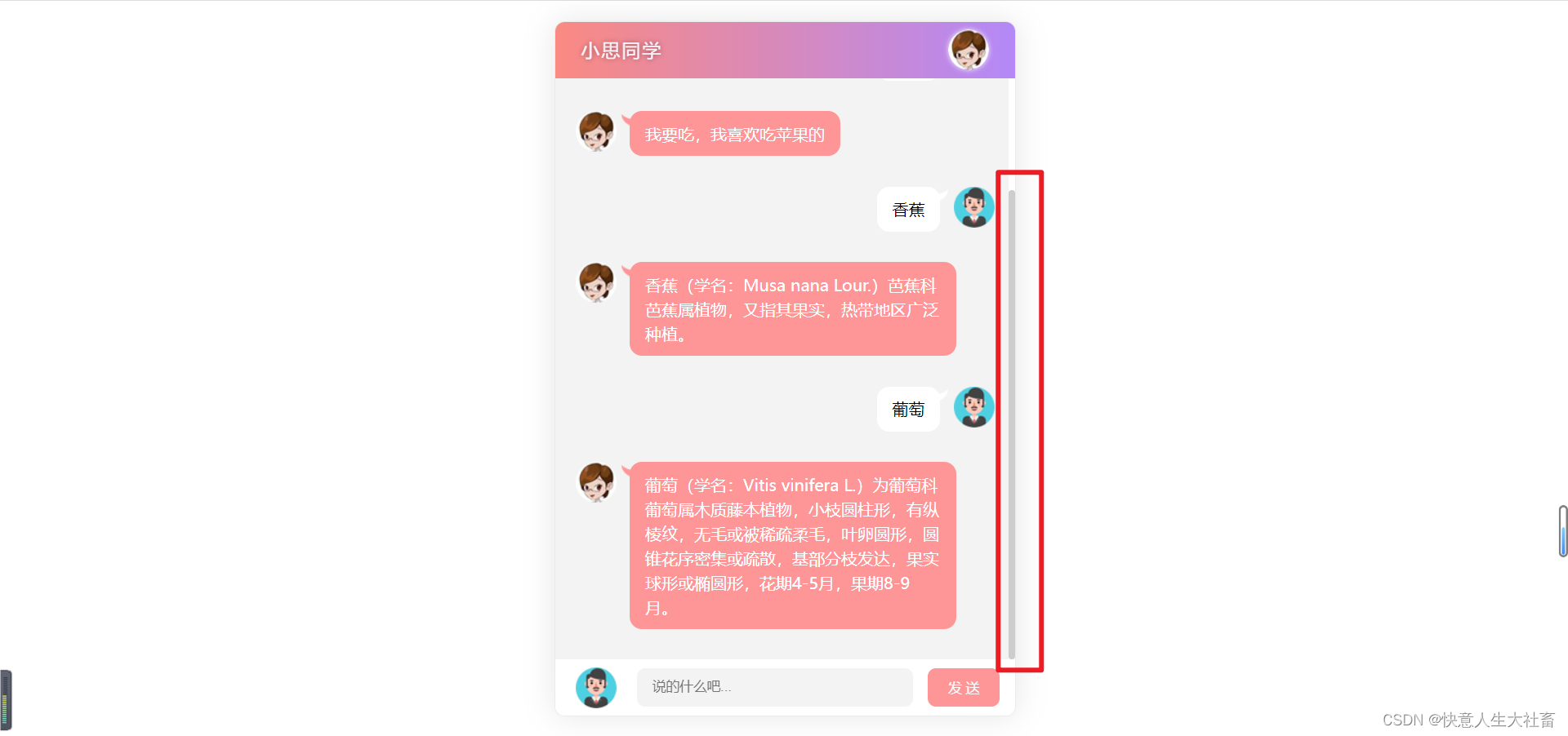 4.在有多次对话之后,右边的滚动条会默认处于右边最下方,以显示最新的对话
