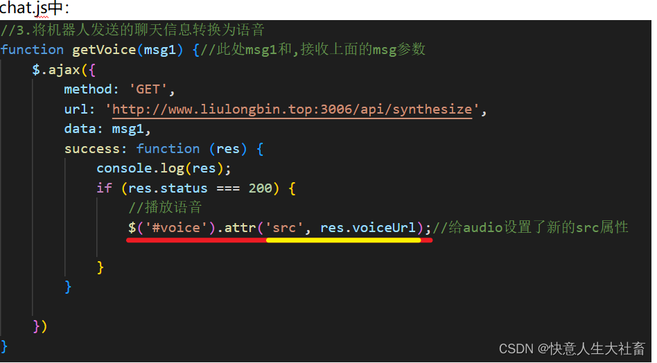 ' + msg + ' ');//发送完毕,实现页面自动滚动到最底部resetui();//调用下面的getVoice函数,传递参数msg给下面的text2getVoice(msg);}}})}//3.将机器人发送的聊天信息转换为语音function getVoice(msg1) {//此处msg1和,接收上面的msg参数$.ajax({method: 'GET',url: 'http://www.liulongbin.top:3006/api/synthesize',data: {text: msg1},success: function (res) {// console.log(res);if (res.status === 200) {//播放语音$('#voice').attr('src', res.voiceUrl);//给audio设置了新的src属性}}})}//4.按回车键可以发送自己聊天消息内容$('#ipt').on('keyup', function (e) {//e.key返回按键的字符串形式(ie9以上支持)//用户弹起键盘的回车键的时候if (e.key === 'Enter') {//触发发送的按钮$('#ntnSend').click();}})