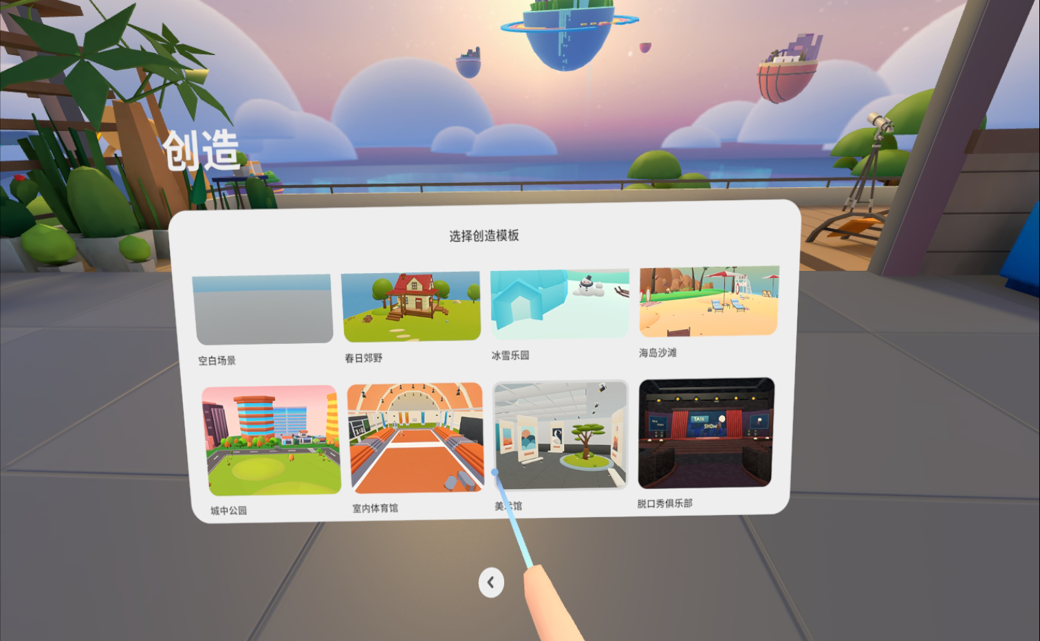 你可以选择空白场景,或预设好的10多种模板,官方提供了比如:春日郊游、脱口秀俱乐部、多人会议室、室内体育馆、海岛沙滩等等模板,你可以在这些基础上进行个性化的创造,从而减少具有很多重复性工作的基础构建环节,提升用户的使用体验。