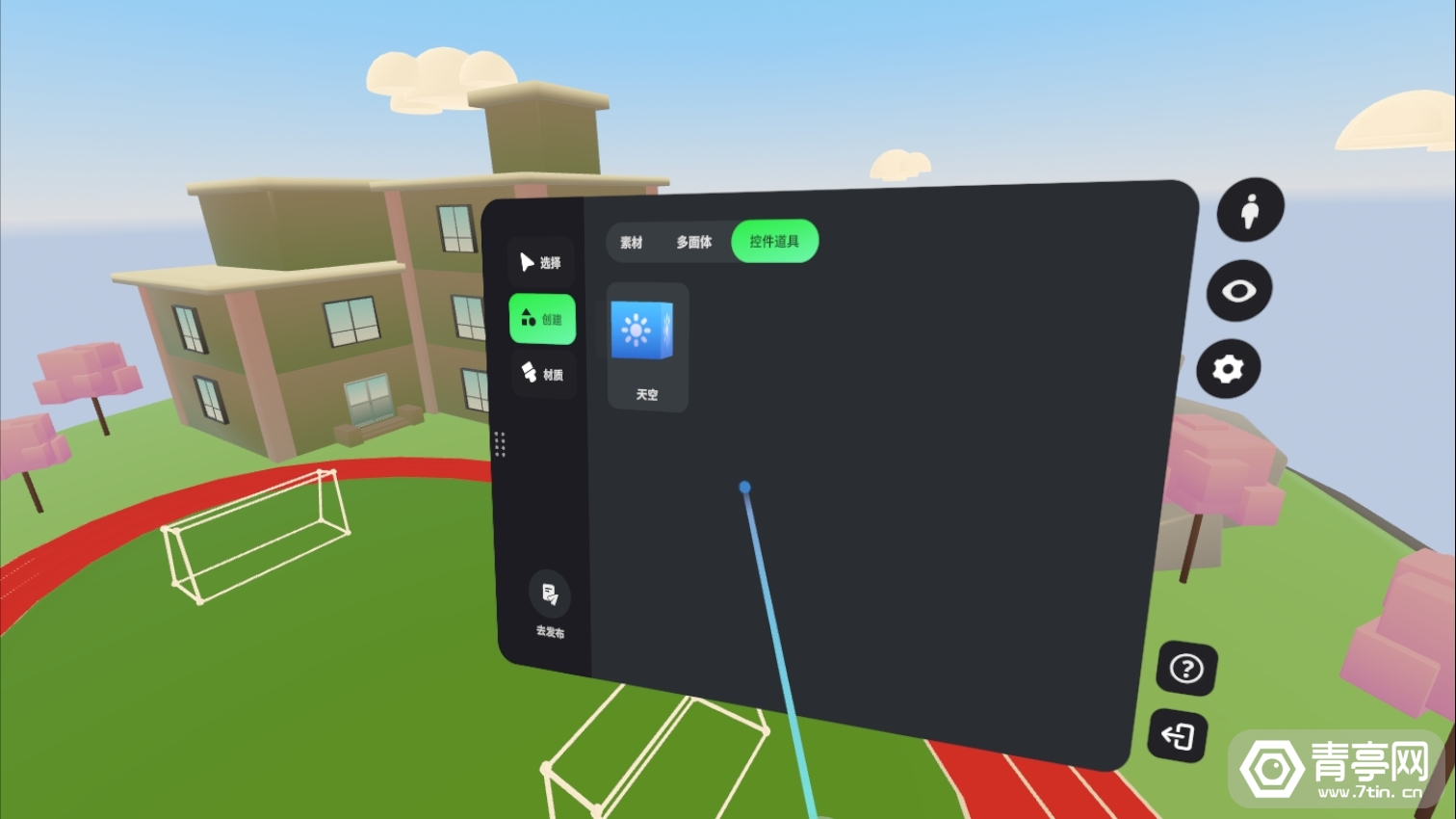 创造场景中提供了一些基础功能,可以让你构建模拟很多不同的场景,这里就需要发挥大家的想象力了,通过官方提供的大量素材、多面体进行场景的搭建,像是地面等大型的物体可以通过多面体来构建,比如土地,围墙等等。吐槽一下,当前素材种类太多但没有搜索功能不方便快速查找,希望快点支持搜索。