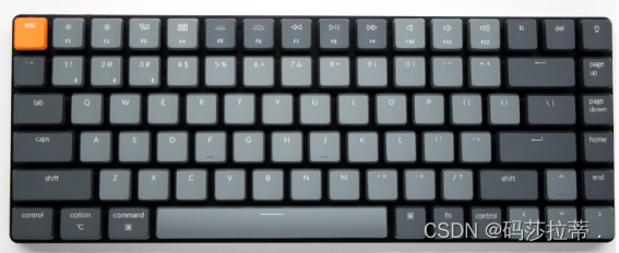 84键的布局,与笔记本的键盘布局很接近,上方F区有多种快捷键。键帽是深灰和浅灰搭配,沉稳大气中透着冷峻的科技感,橙色的ESC键点缀,为画面带来亮色,矮轴键盘,Keychron K7在厚度上控制得很好,略微倾斜的角度,整体厚度只有常规机械键盘的一半。底座是铝合金,保障了强度,又控制了重量,看起来非常具有科技感。