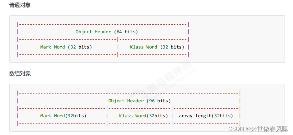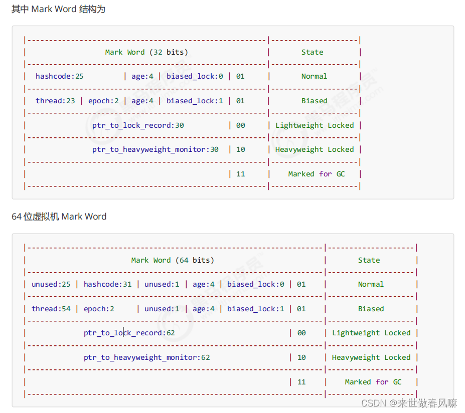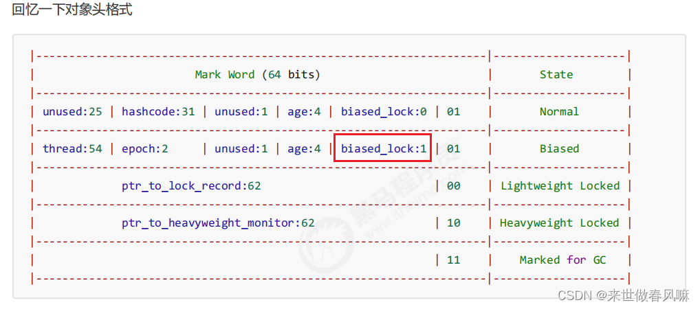 一个对象创建时: (1)如果开启了偏向锁(默认开启),那么对象创建后,markword 值为 0x05 即最后 3 位为 101,这时它的 thread、epoch、age 都为 0 (2)偏向锁是默认是延迟的,不会在程序启动时立即生效,如果想避免延迟,可以加 VM 参数 -XX:BiasedLockingStartupDelay=0 来禁用延迟 (3)如果没有开启偏向锁,那么对象创建后,markword 值为 0x01 即最后 3 位为 001,这时它的 hashcode、 age 都为 0,第一次用到 hashcode 时才会赋值