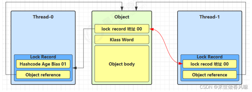 (1)当 Thread-1 进行轻量级加锁时,Thread-0 已经对该对象加了轻量级锁