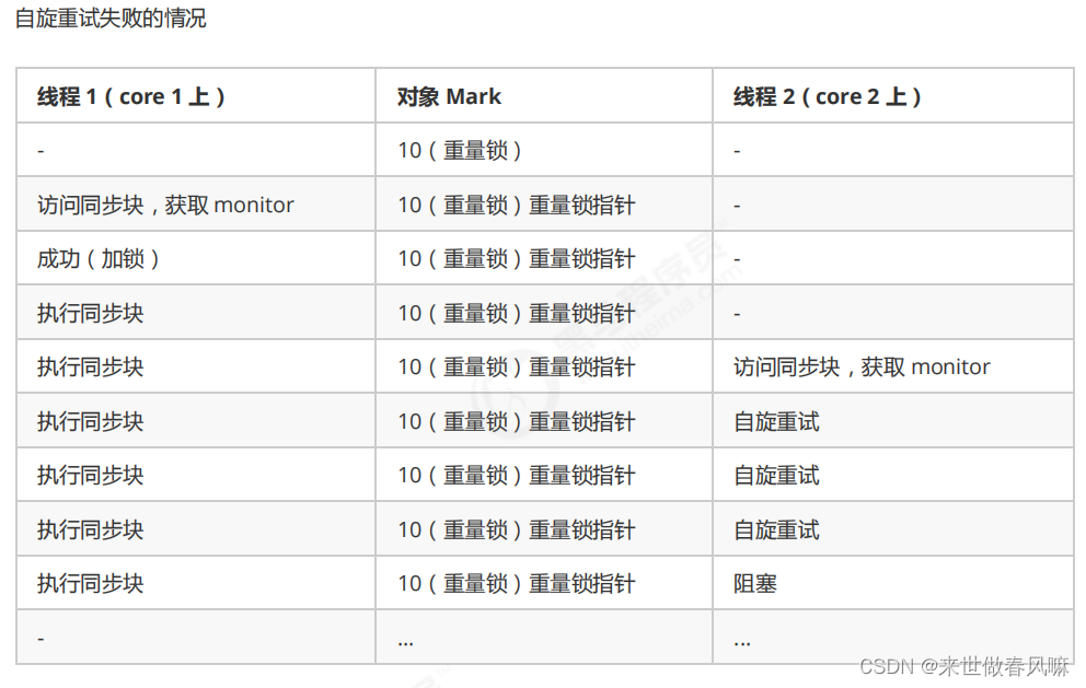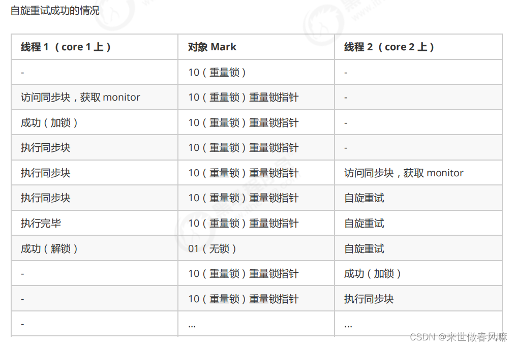重量级锁竞争的时候,还可以使用自旋来进行优化,如果当前线程自旋成功(即这时候持锁线程已经退出了同步块,释放了锁),这时当前线程就可以避免阻塞。