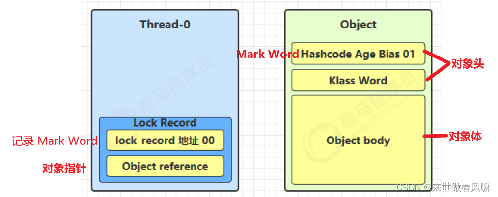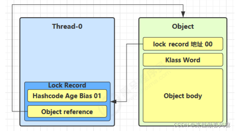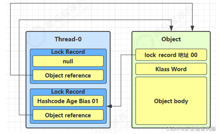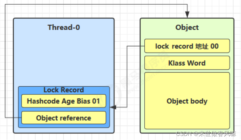 (2)让锁记录中 Object reference 指向锁对象,并尝试用 cas 替换 Object 的 Mark Word,将 Mark Word 的值存入锁记录