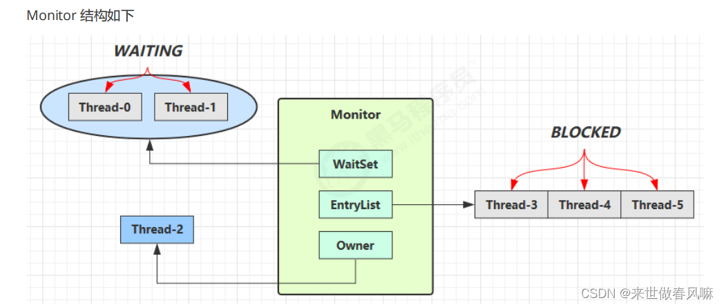 (5)图中 WaitSet 中的 Thread-0, Thread-1 是之前获得过锁的,当条件不满足加入 WAITING 状态的线程,后面涉及到 wait-notify 时会分析