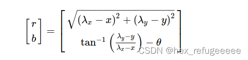 机器人在某个Pose处用激光测量到了某个空间点,得到了它离自己的距离与角度;——Binary Edge,顶点为一个2D Pose:[x,y,\Theta ]^{T}和一个Point:[\lambda x,\lambda y]^T,观测数据是距离r和角度b,那么观测方程为: