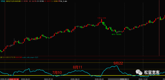 上图中蓝色线为ATR归一化时序数据,黄色为0.3,红色为0.8。我们通过定性观察可以看到,疫情3年黑色金属指数波动率最低为0.3,其余大部分都在0.5以上,甚至阶段性出现1的情况(归一化后的波动率位于0-1之间)。