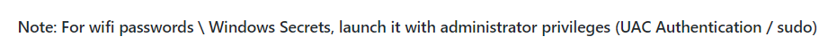 注意:对于wifi密码\ Windows Secrets,请以管理员权限启动它(UAC身份验证 / sudo)