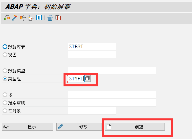 执行T-CODE:SE11,进入ABAP字典:初始屏幕,选择类型组,输入要定义的类型组名字(要以Z开头!),点击创建按钮,如下图所示: