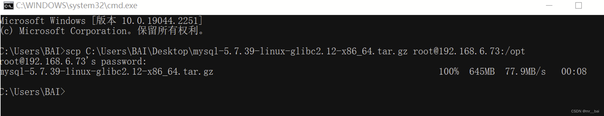 scp C:\Users\BAI\Desktop\mysql-5.7.39-linux-glibc2.12-x86_64.tar.gz root@192.168.6.73:/opt