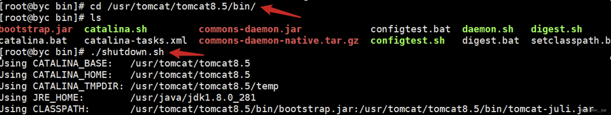 进入tomcat目录下的bin文件。执行下边的shutdown.sh
