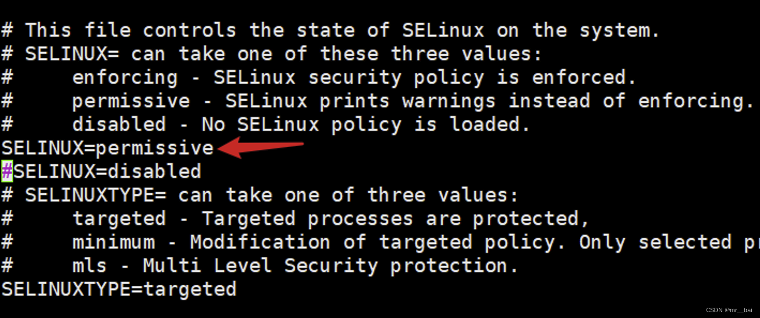 编辑 /etc/selinux/config 将SELinux更改为宽松模式