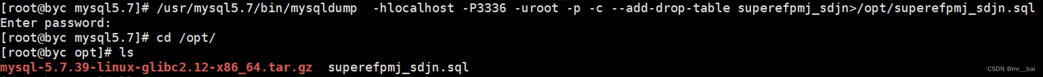 /usr/mysql5.7/bin/mysqldump -hlocalhost -P3336 -uroot -p -c --add-drop-table superefpmj_sdjn >/opt/superefpmj_sdjn.sql