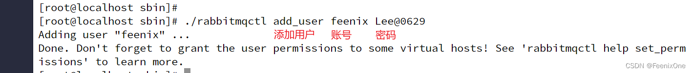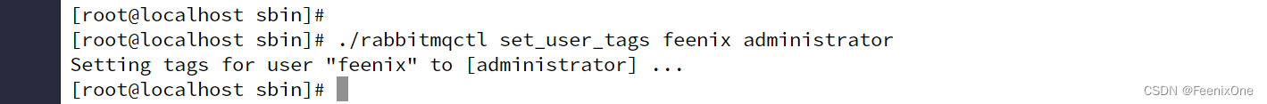 用户账号创建成功,还不忘贴心提醒给创建的账号授予权限。既然如此,那么就将刚刚创建的用户授予管理员的角色:./rabbitmqctl set_user_tags feenix administrator