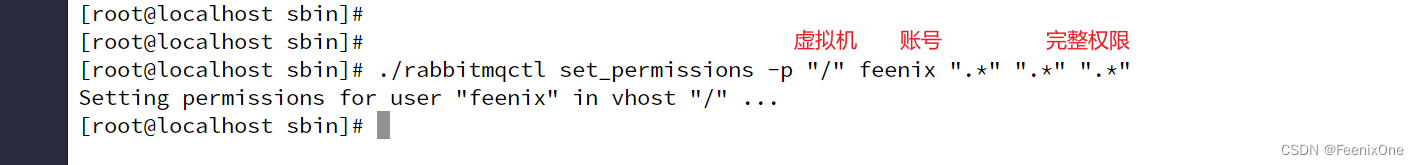 再给账户授予完整的操作权限:./rabbitmqctl set_permissions -p "/" feenix ".*" ".*" ".*"