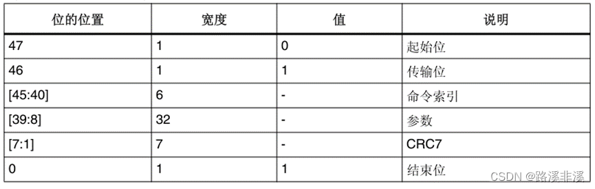 SDIO所有的命令和响应都是在SDIO_CMD引脚上面传输的,命令长度固定为48位,SDIO命令格式如下表所示: