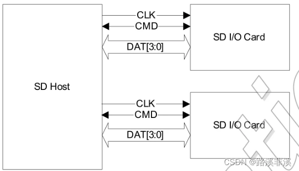 - Data: 数据是双向传送的。可以设置为1线模式,也可以设置为4线模式。数据是通过DAT0-DAT3信号线传输的。
