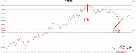 1、7月2日到11月11日整体波动率呈现不断收缩状态,期间8月-9月份波动率有抬升过程,且也伴随绩效的震荡抬升。但是在整体波动率收缩状态下,整体绩效也是一泻千里。