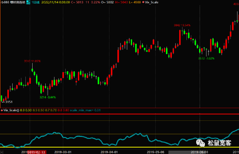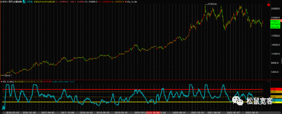 上图中蓝色线为ATR归一化时序数据,黄色为0.3,红色为0.8。我们通过定性观察可以看到,疫情3年黑色金属指数波动率最低为0.3,其余大部分都在0.5以上,甚至阶段性出现1的情况(归一化后的波动率位于0-1之间)。