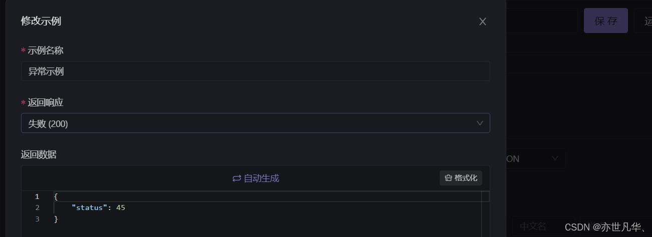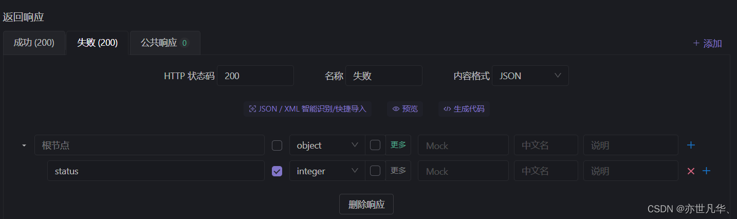 为了方便区别自己的接口是否成功写入,可以写入一个错误的响应以及案例来进行区别,可以将错误的响应里面的内容删除一点,并根据错误的响应生成一个异常示例:
