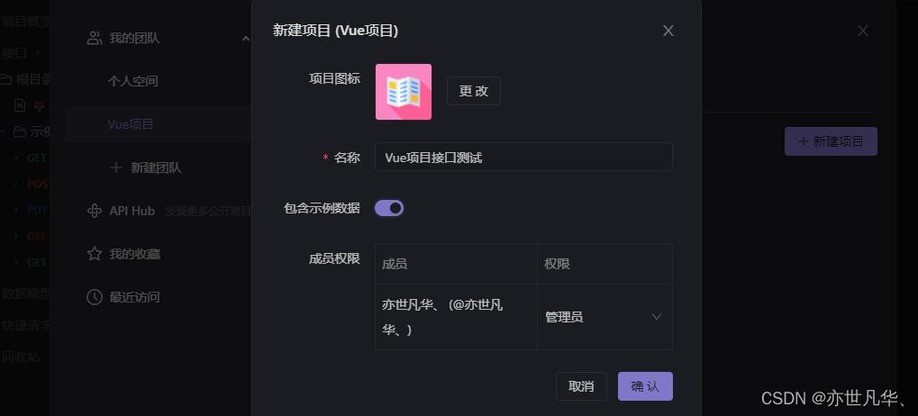 接下来新建项目,输入名称,项目图标自定,如果第一次使用可以允许包含示例数据,因为我这里没有定向邀请其他成员,项目中就只有我一个人,点击确认即可。