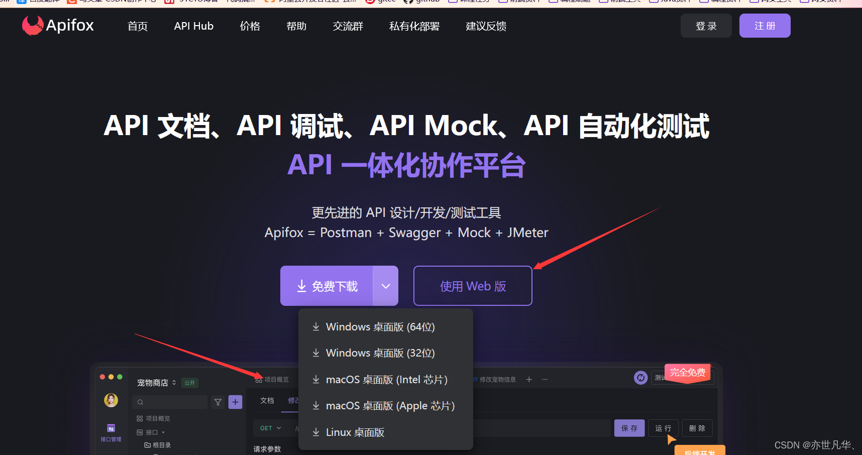 安装的话就很简单了,百度搜索 Apifox ,或点击右侧的网址 Apifox网址 ,进入网址选择自己电脑适配的系统以及需求进行选择使用。