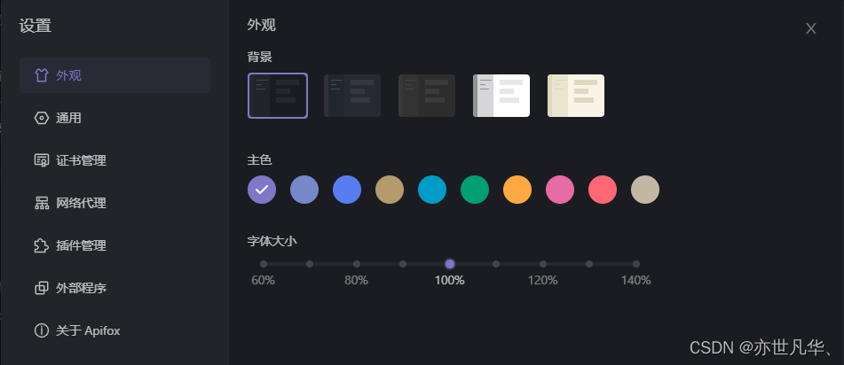 对于页面的风格自己也可以进行设置, 打开设置对页面的主题颜色和字体大小可以自定义,还有一些其他的网络代理、证书代理调配等。