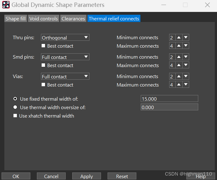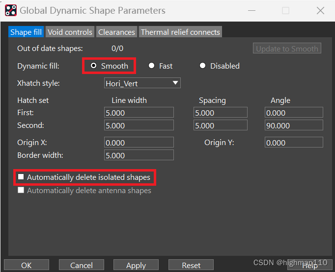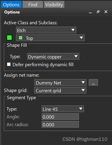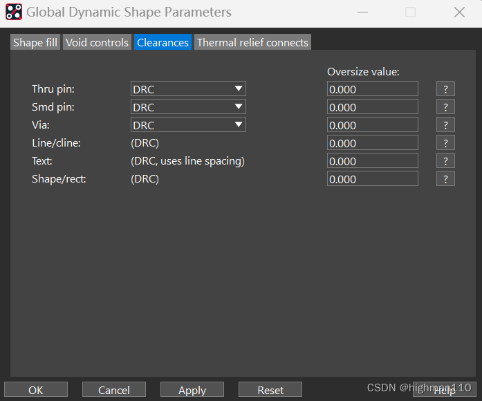 单板上的电源部分、铺地都需要用到铜皮操作。先来熟悉一下铺铜的参数设置。Shape-global dynamic parameters,设置全局的动态铜皮参数。