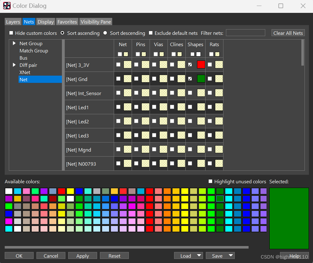 当电源平面有多种电源,可用不同颜色加以区分,在颜色管理器中设置: