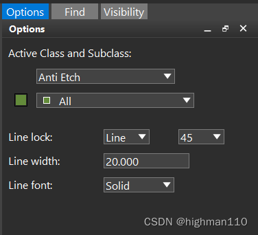 先绘制分割线,add-line,在option面板选择画线层为anti etch的所有层,线宽根据实际要求分割宽度设置。