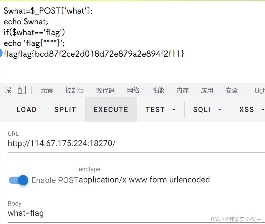 正常就是通过post传递一个what=flag的参数进去,可以通过hackbar来实现