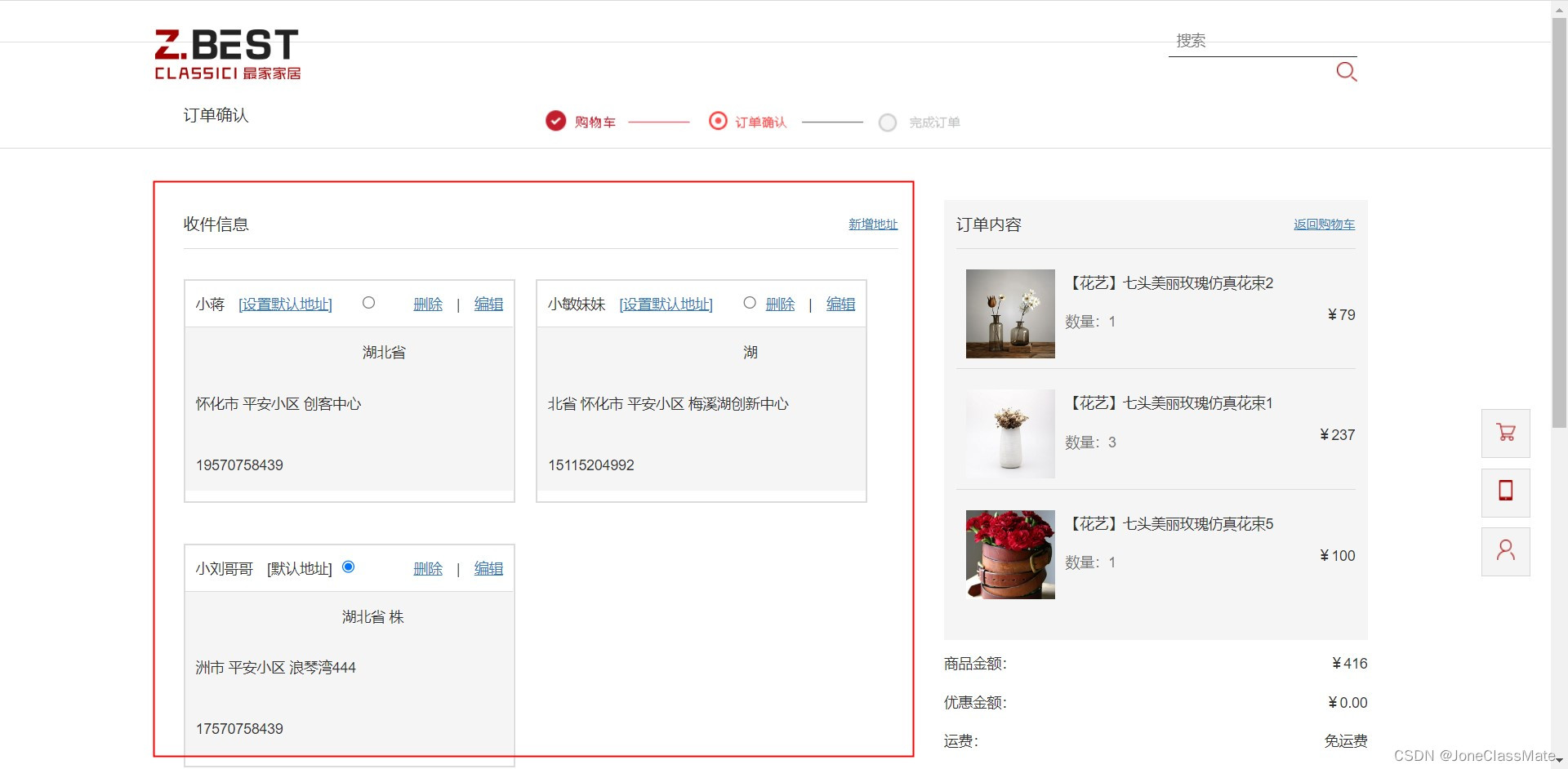 1.9 可在结算页面中 (增删改查,用户我的收货地址)
