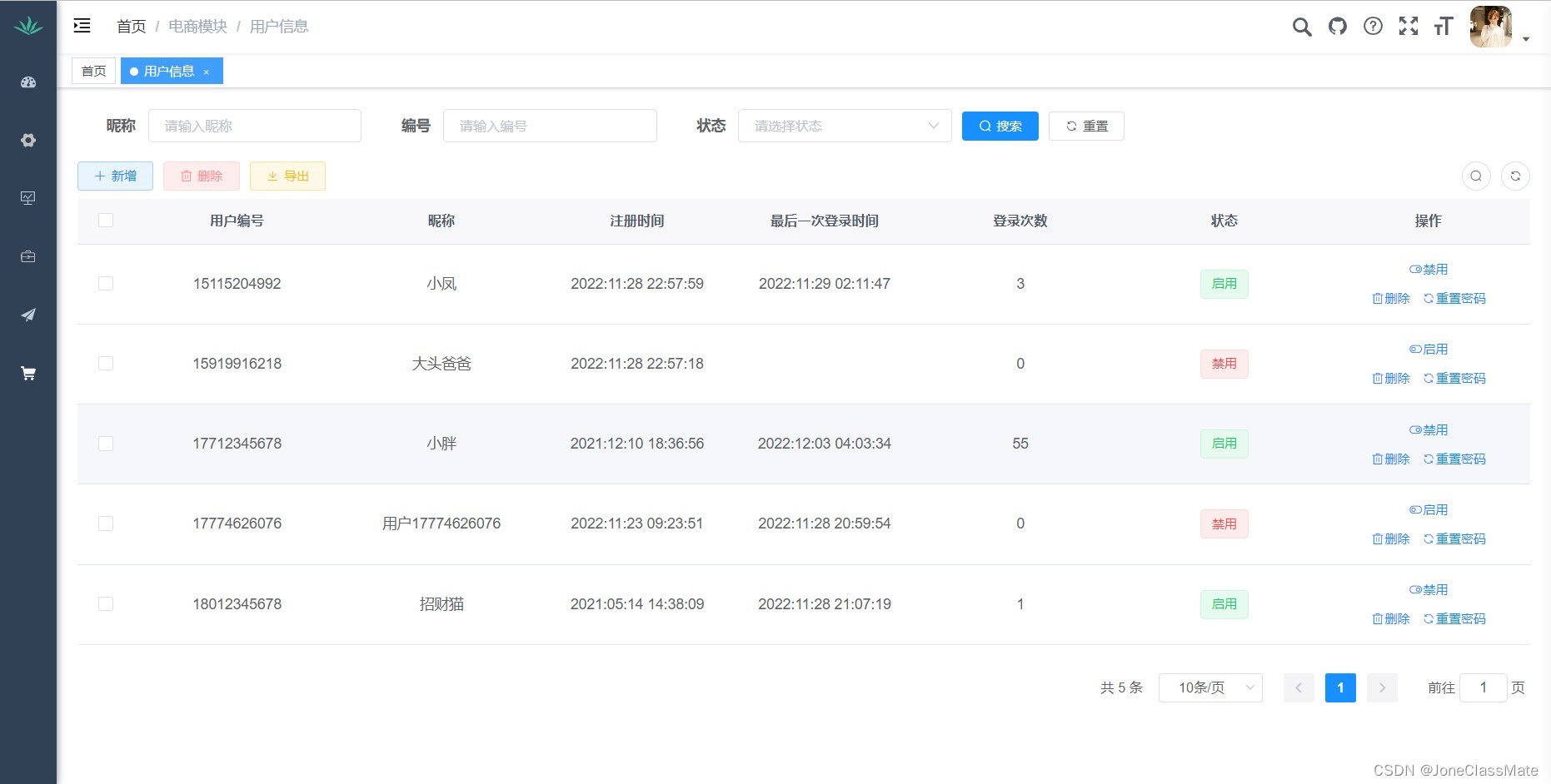 2.2 管理用户信息 (新增,删除,禁用,启用,重置密码)