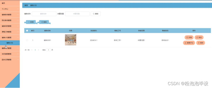 健身计划管理,在健身计划管理页面可以对索引、健身名称、封面、运动时长、教练工号、体重范围、教练姓名等内容进行详情、修改、查看评论或删除等操作;如图5-18所示。