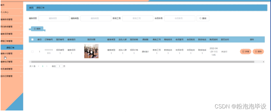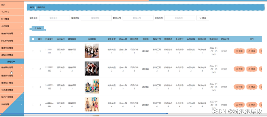 课程订单管理,在课程订单管理页面可以对索引、订单编号、项目编号、健身项目、项目封面、健身类型、适合人群、项目价格、课时数、教练工号、教练姓名、会员账号、会员姓名、联系电话、购买时间、是否支付等内容进行详情、修改或删除等操作;如图5-16所示。