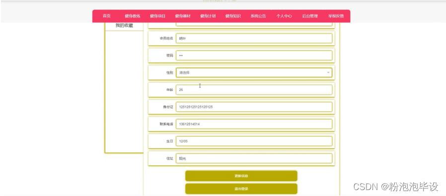 个人中心,在个人中心页面通过填写会员账号、会员姓名、密码、性别、 年龄、身份证、联系电话、生日、住址等内容进行更新信息等操作,并可以根据我的收藏进行相应的操作,如图5-8所示。