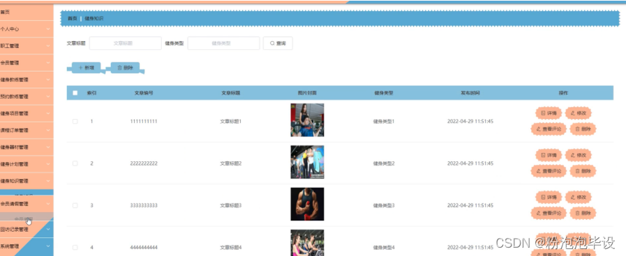 健身知识管理,在健身知识管理页面可以对索引、文章编号、文章标题、 图片封面、健身类型、发布时间等内容进行详情、修改、查看评论或删除等操作;如图5-19所示。
